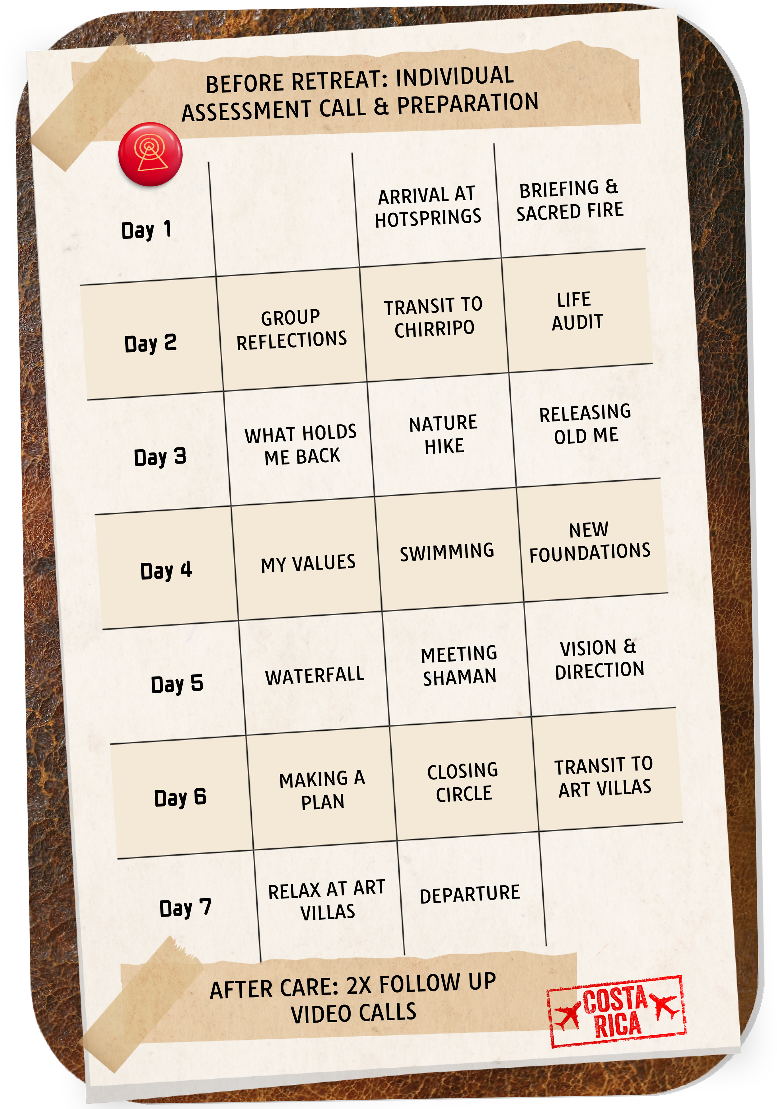 For many men, life splits to “before and after Costa Rica” because this week delivers a rare mix of experiences that hits you on every level: raw jungle renews your system and makes you feel alive again; time away from noise clears your head and shows you what truly matters (and what doesn’t); the most honest conversations with men who become your brothers makes you suddenly see your life, relationships, and choices through new perspectives; and guided rites of passages help you shed old patterns, close a chapter, and step into the next one with clarity and direction.